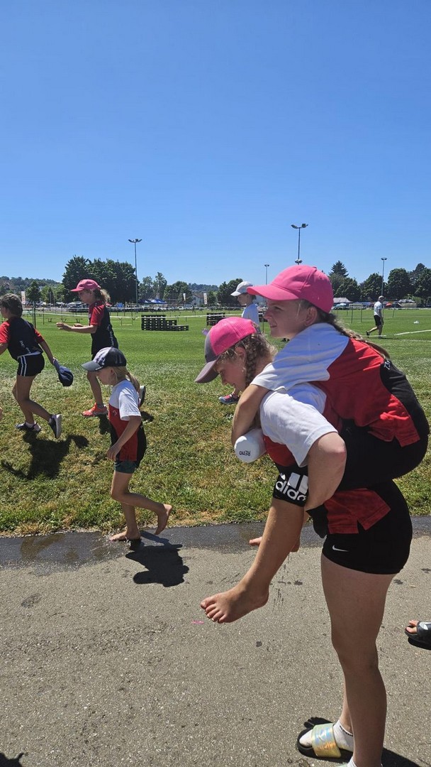 Zum Zmittag gab es Gehacktes und Hörnli zur Stärkung und ausserdem eine wohl verdiente Pause. Am Nachmittag fanden die Vereinsstafetten statt. Bei inzwischen tropischen Temperaturen wurden nochmals alle Reserven aktiviert, um die Strecke von 60 m schnellstmöglich hinter sich zu bringen. Natürlich wurde die jeweilige Gruppe von den anderen kräftig angefeuert.