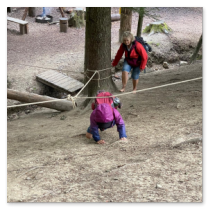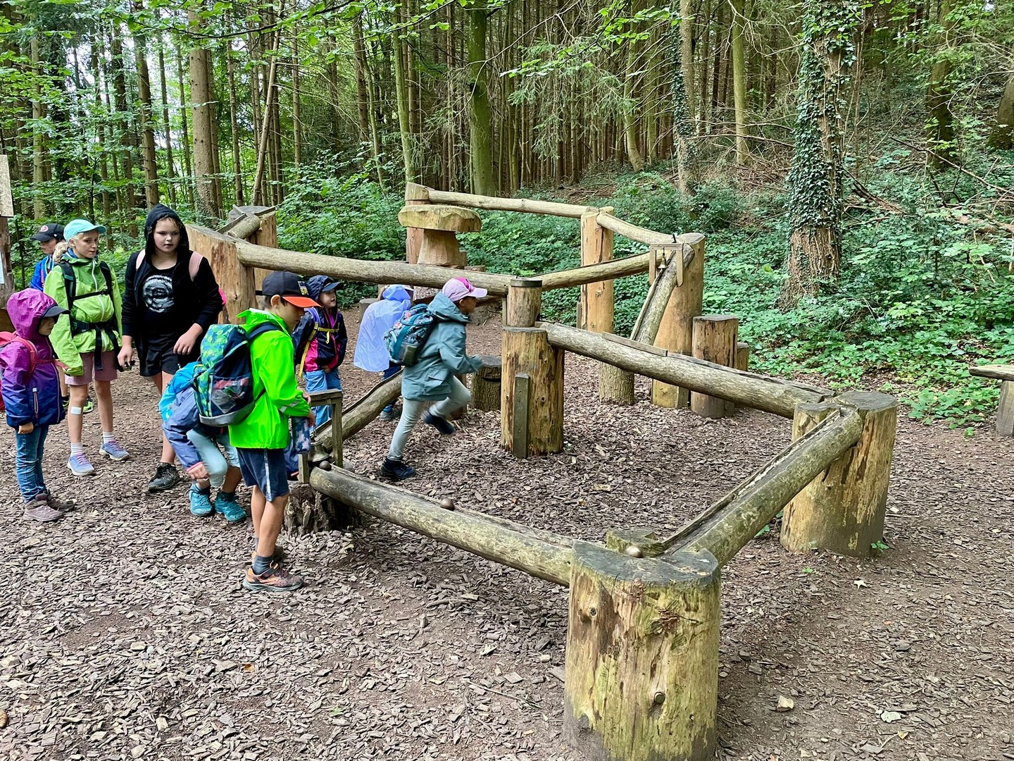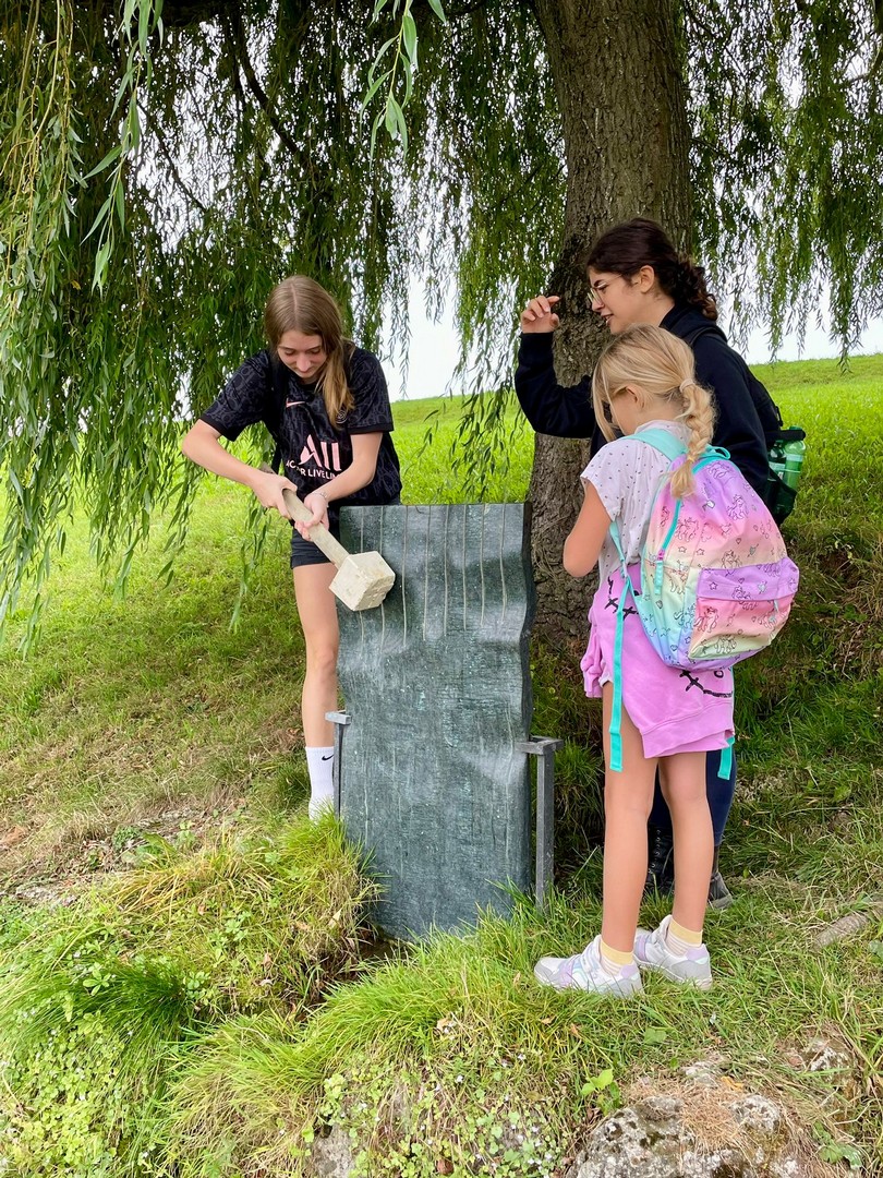Nach dem Mittagessen setzte die Gruppe ihren Ausflug fort und machte sich auf den Weg zum Barfusspfad am Nollen. Das Erlebnis den Boden in seiner unterschiedlichen Beschaffenheit, wie harter Kies, weicher Waldboden, nasses Gras, Bachbett, etc. unter den blossen Füssen zu spüren, bereitete unterschiedlichen Genuss. Der Höhepunkt des Nachmittags war der Schlammsteg, der bei allen Teilnehmern für viel Spass sorgte. Besonders freuten sich die Kinder, als sie am Ende des Pfads die Schuhe wieder anziehen konnten. Gegen Nachmittag zog plötzlich Regen auf, und die Gruppe entschied sich, die Heimreise etwa eine Stunde früher als geplant anzutreten. Nass, aber zufrieden, erreichten alle Teilnehmer am späten Nachmittag wieder den Bahnhof in Tägerwilen. Trotz des Regens und einer kleinen Verletzung, die schnell wieder vergessen war, blickten alle auf einen erlebnisreichen Tag zurück.