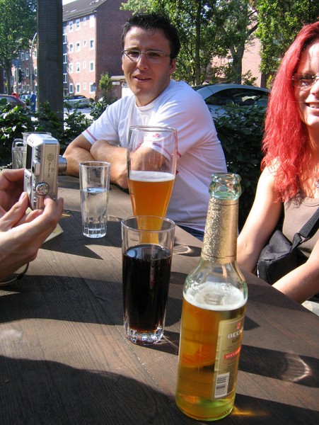 Ab nach Hamburg. Verschiebung zur Unterkunft mit Bus, Zug, U−Bahn. Super schöne Jugendherberge, geiles Wetter, gute Stimmung. Hunger, zweites Bier, Hunger gestillt!