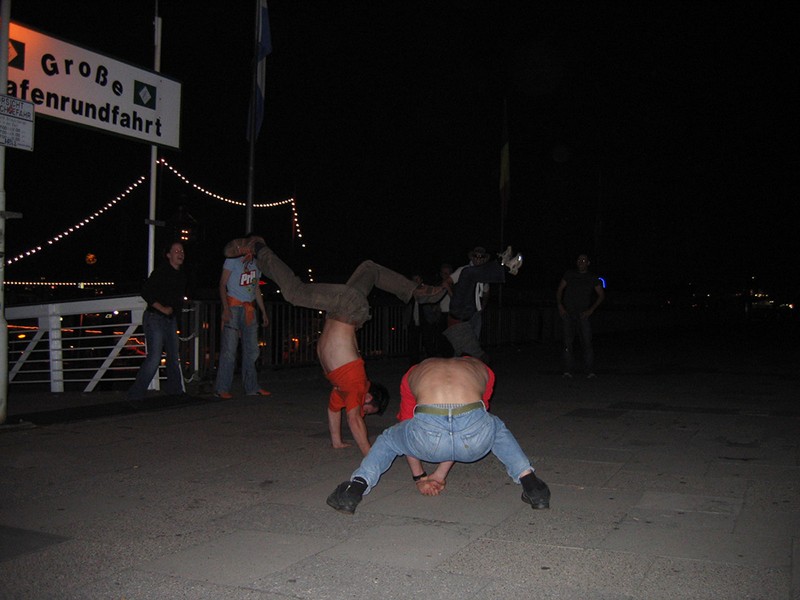 Doch zuerst wurde mittels Handstand−Wettbewerb quasi ein Alkoholtest durchgeführt. Dieser fiel bei allen Teilnehmenden negativ aus, somit muss der Sieger positiv gewesen sein. Die anwesenden Hafenbesucher dürften darüber wohl anders gedacht haben. «Scheiss−Touristen»!